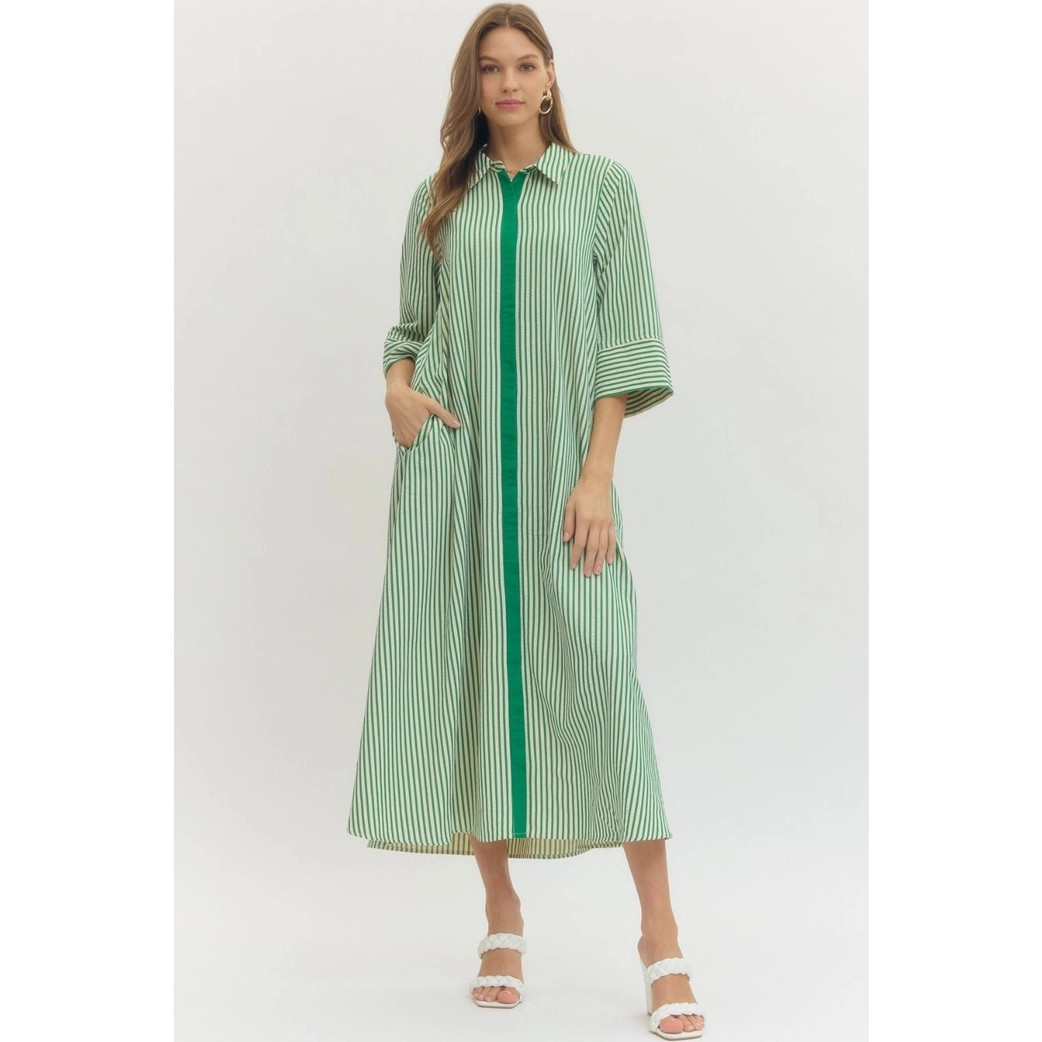 A timeless striped midi shirt dress with modern updates—lightweight, polished, and effortlessly wearable.