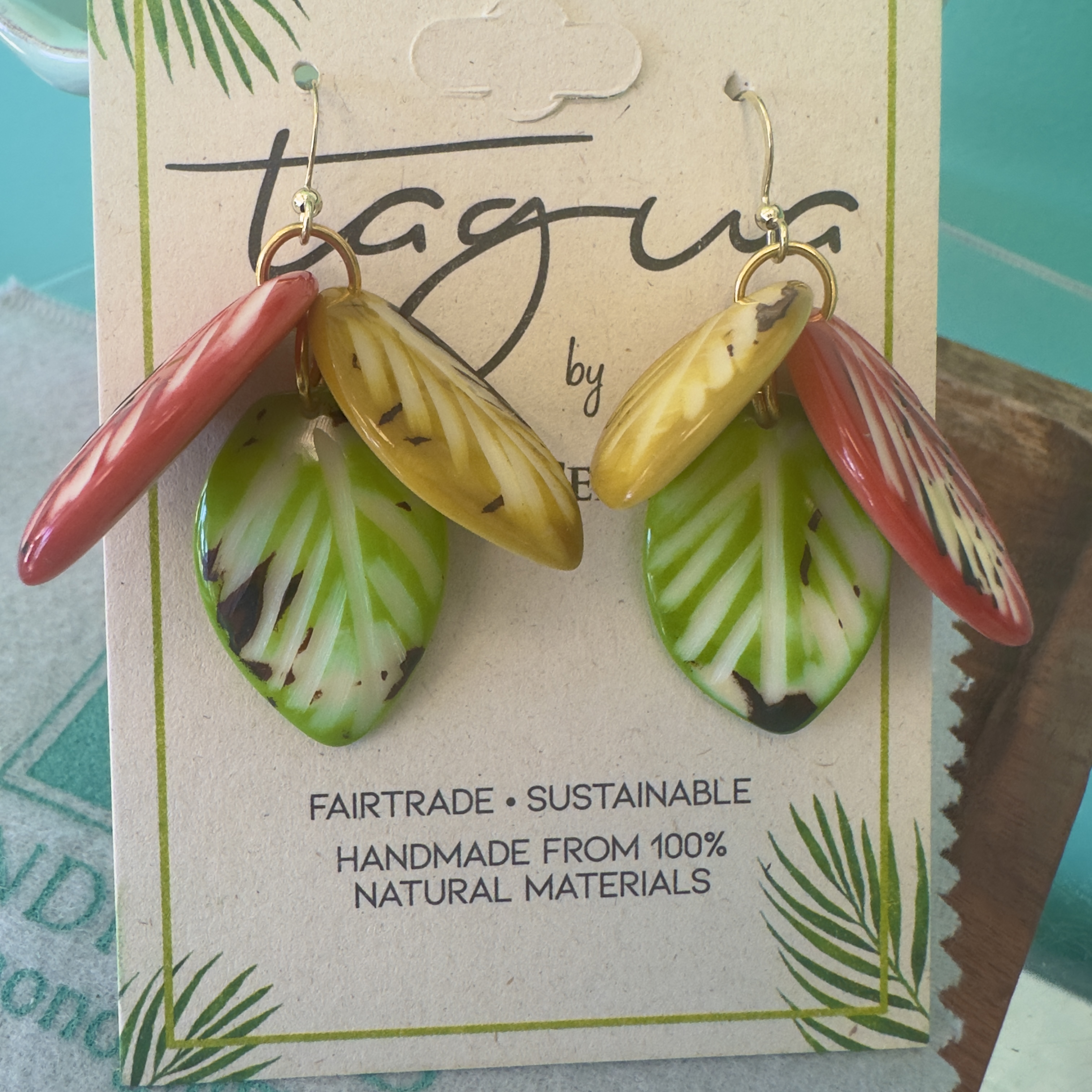 Handcrafted by skilled artisans using sustainable tagua nut—often called vegetable ivory—each pair showcases organic texture and subtle variation, making every set truly one of a kind. The botanical leaf design brings a nature-inspired touch that pairs effortlessly with casual outfits, resort wear, or elevated everyday looks.