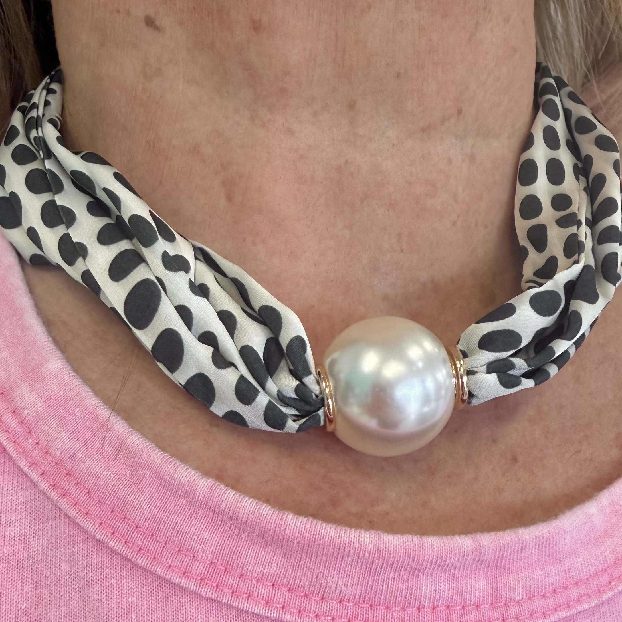 Our Oversized Pearl Magnetic Scarf Necklace in dotted print is the trending boutique favorite of spring and summer that blends soft scarf styling with a bold pearl statement.