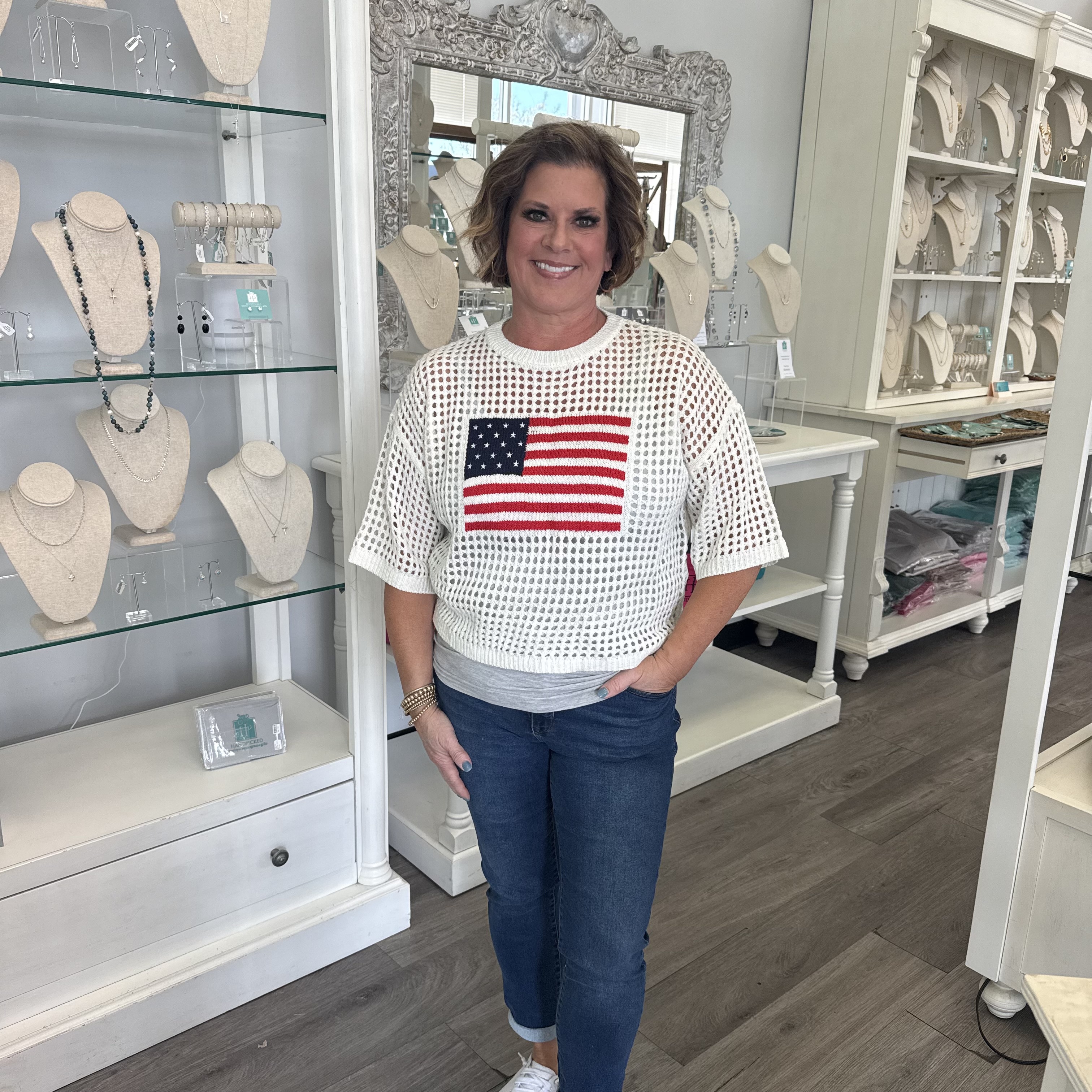 Also available in navy > Flag Open Knit Crochet Sweater Top- Navy