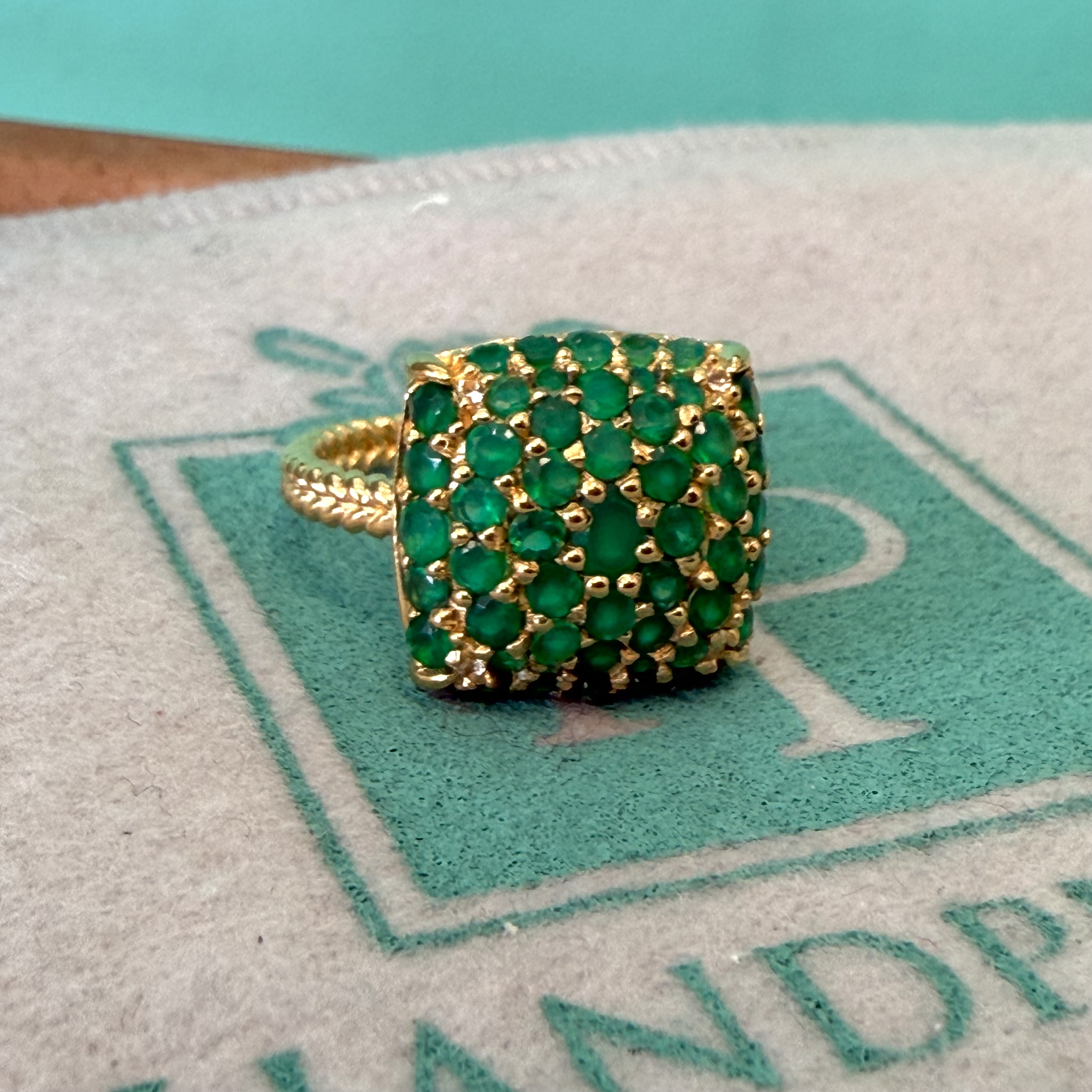 This exquisite gold vermeil ring boasts an eye-catching design, adorned with vibrant green onyx gemstones. The square-shaped setting is densely packed with round green onyx stones of varying sizes, each carefully secured by gold plated prongs. The band itself features a twisted rope-like pattern, adding a touch of elegance and sophistication. This luxurious piece stands out due to its bold color combination, intricate craftsmanship, and the lavish use of precious materials, making it a stunning accessory for any occasion.
