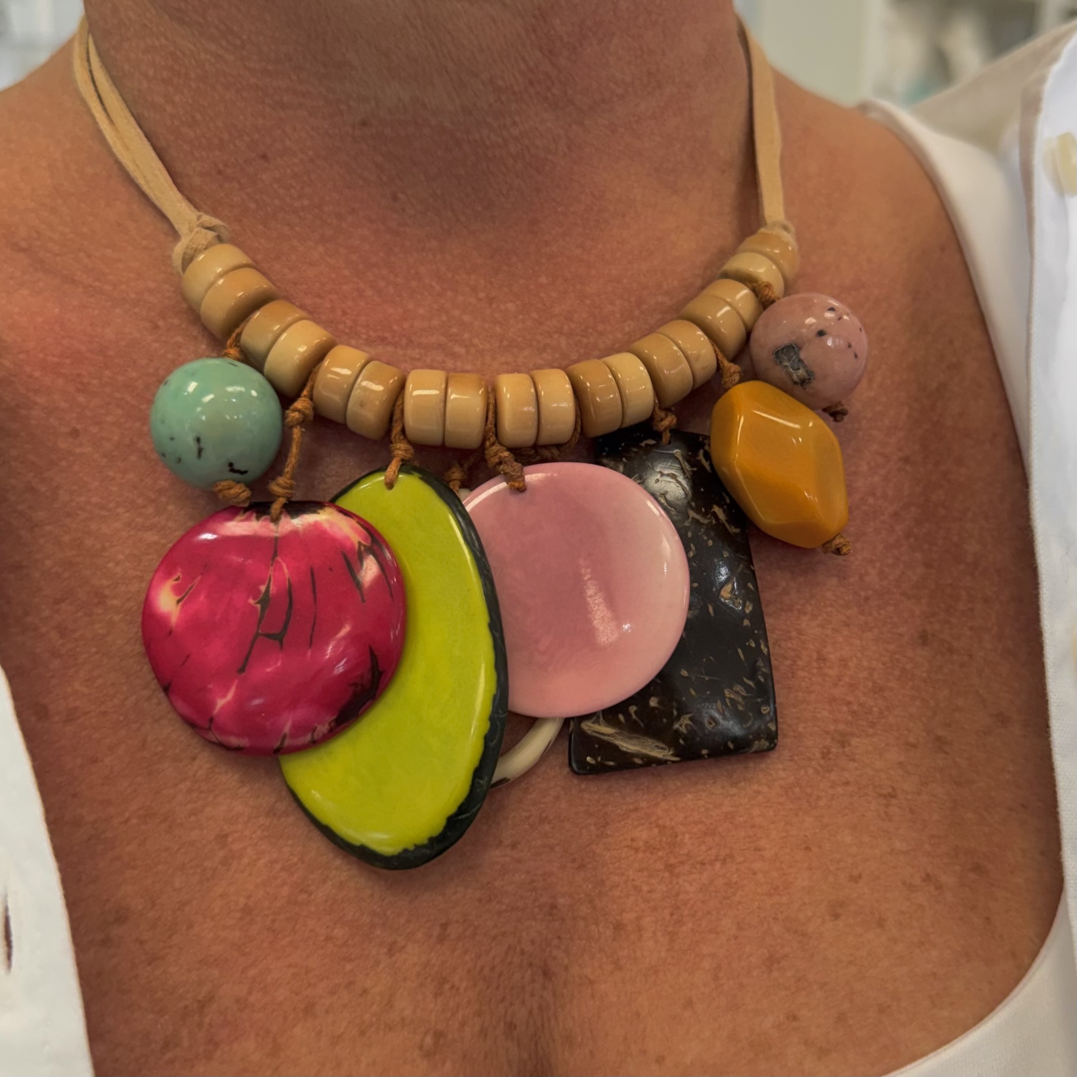 Get noticed in the Jackie Statement Dangle Pendant Beads Necklace – Multi, a standout piece designed for expressive, boho-inspired style. Handmade using sustainably sourced tagua palm nuts, this necklace showcases vibrant multi-color beads strung on supple leather for an organic, artisan-crafted look.