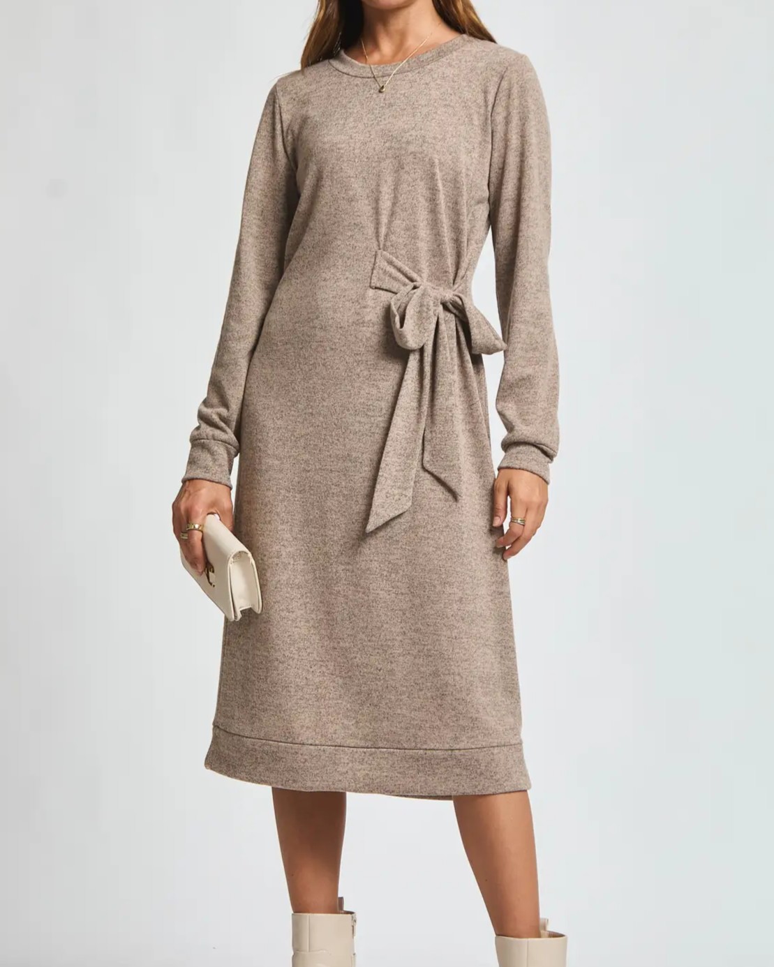 This easy hacci knit tunic dress is so soft and stylish! This is perfect blend of comfort and shape. Designed with a side tie detail that cinches the waist just right, it also adds a touch of definition to the relaxed flowy silhouette.