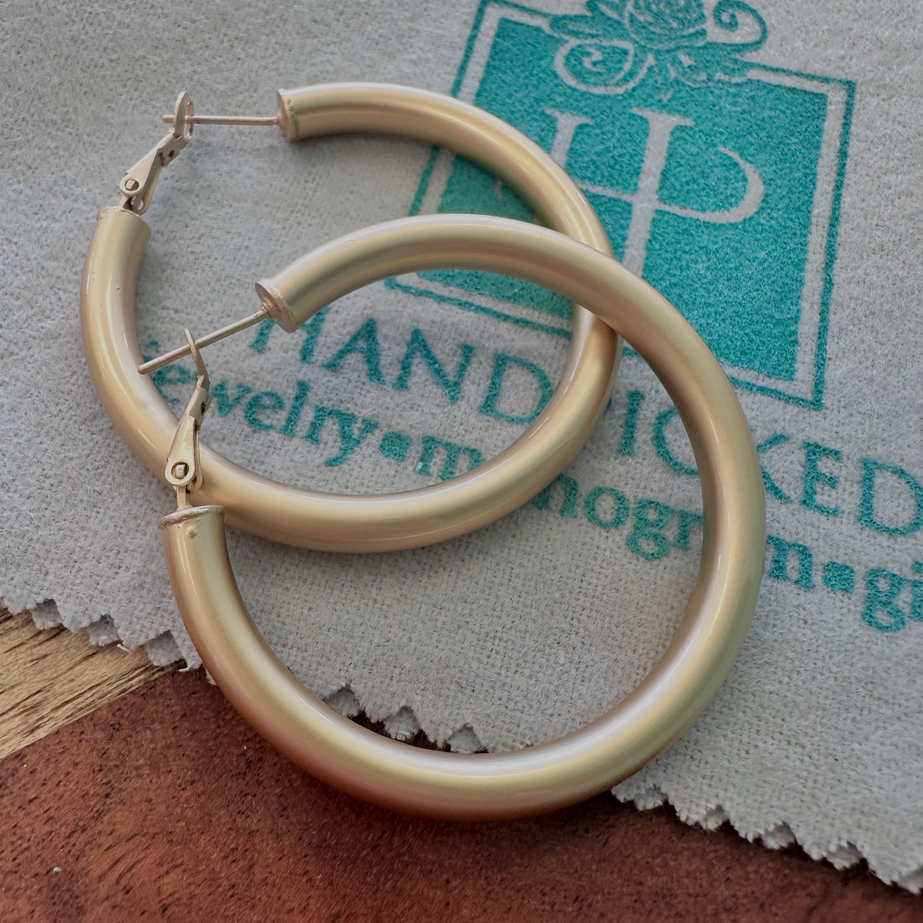 This 48mm tube hoop with clip back closure is available in Matte Gold and Matte Silver while supplies last.