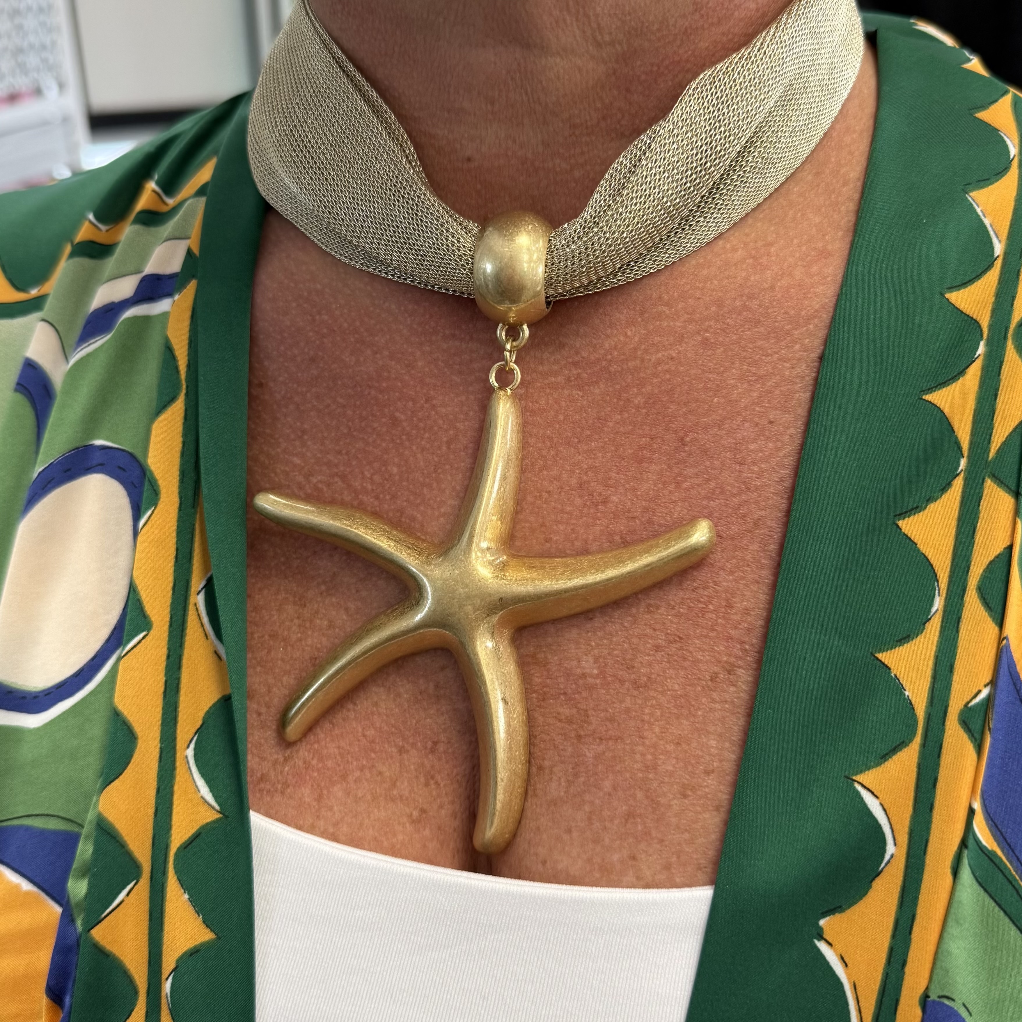 A bold coastal statement featuring a matte gold starfish pendant on a modern mesh chain.