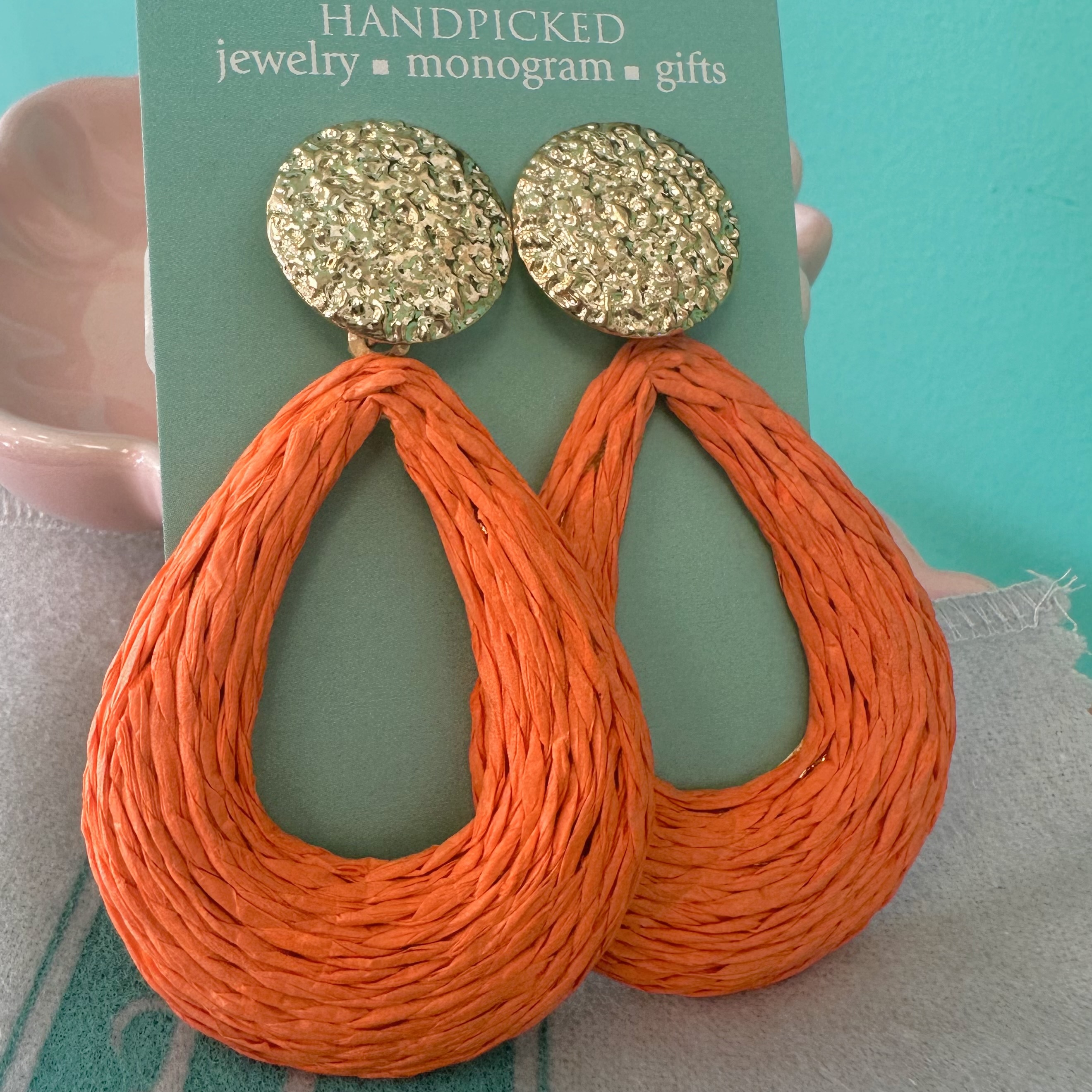 Orange Teadrop Raffia Statement Earrings