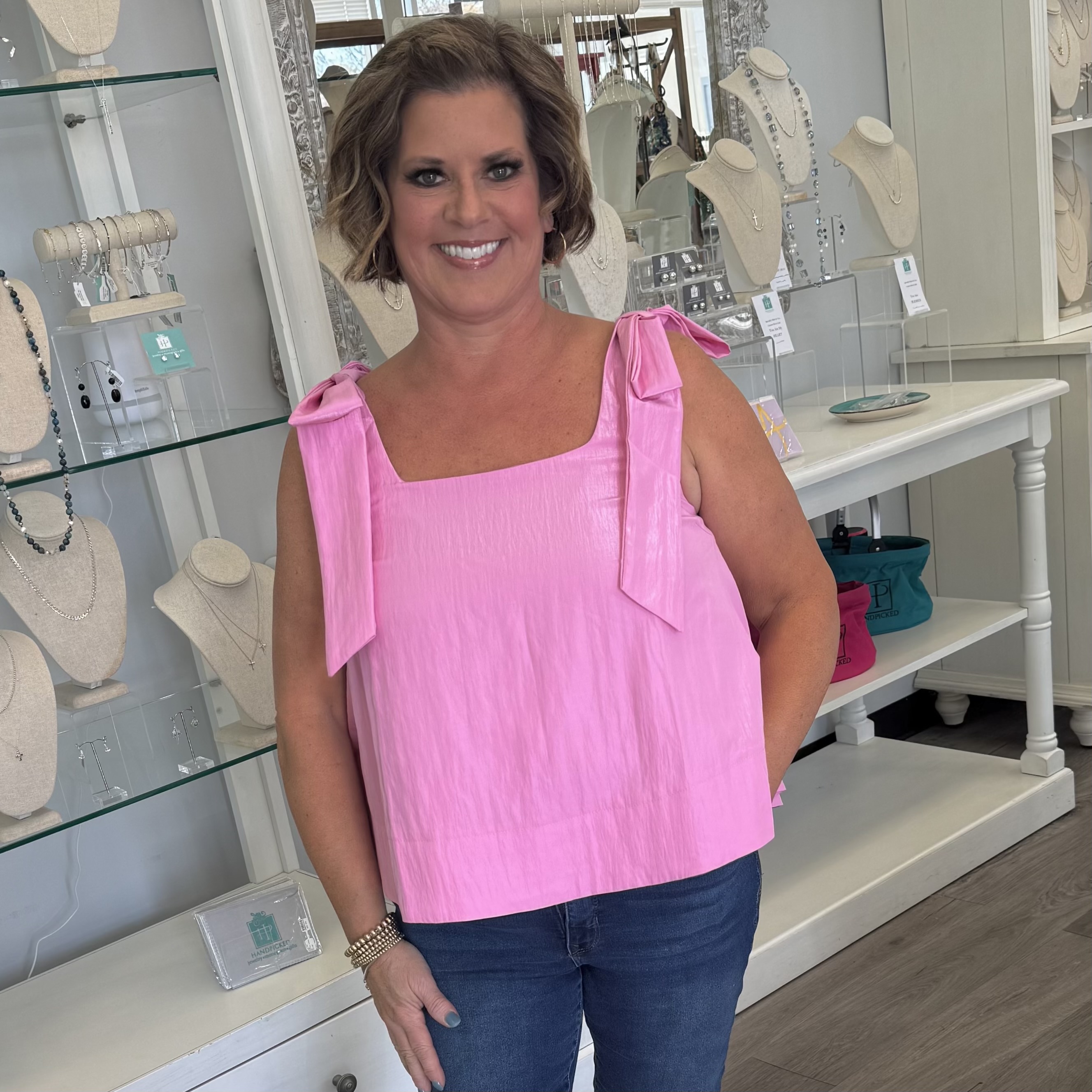 Sweet meets sophisticated in our Scoop Neck Bow Shoulder Flowy Top in Pink.