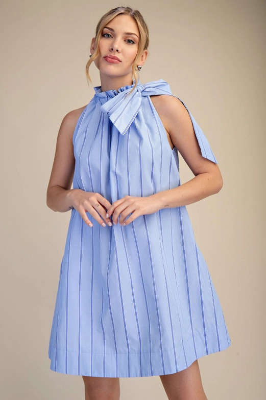 Sleeveless dress featuring a ruffled round neck and tie closure.