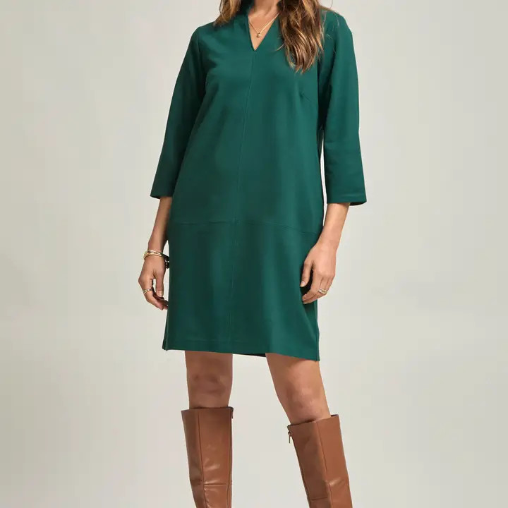 Featuring notch v collar, mid sleeve, just above the knee length, slight a line and pockets.