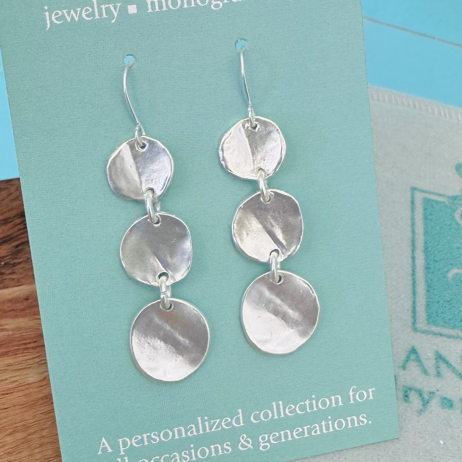 Beautiful linear drop earrings featuring 3 organic connected lightweight discs.