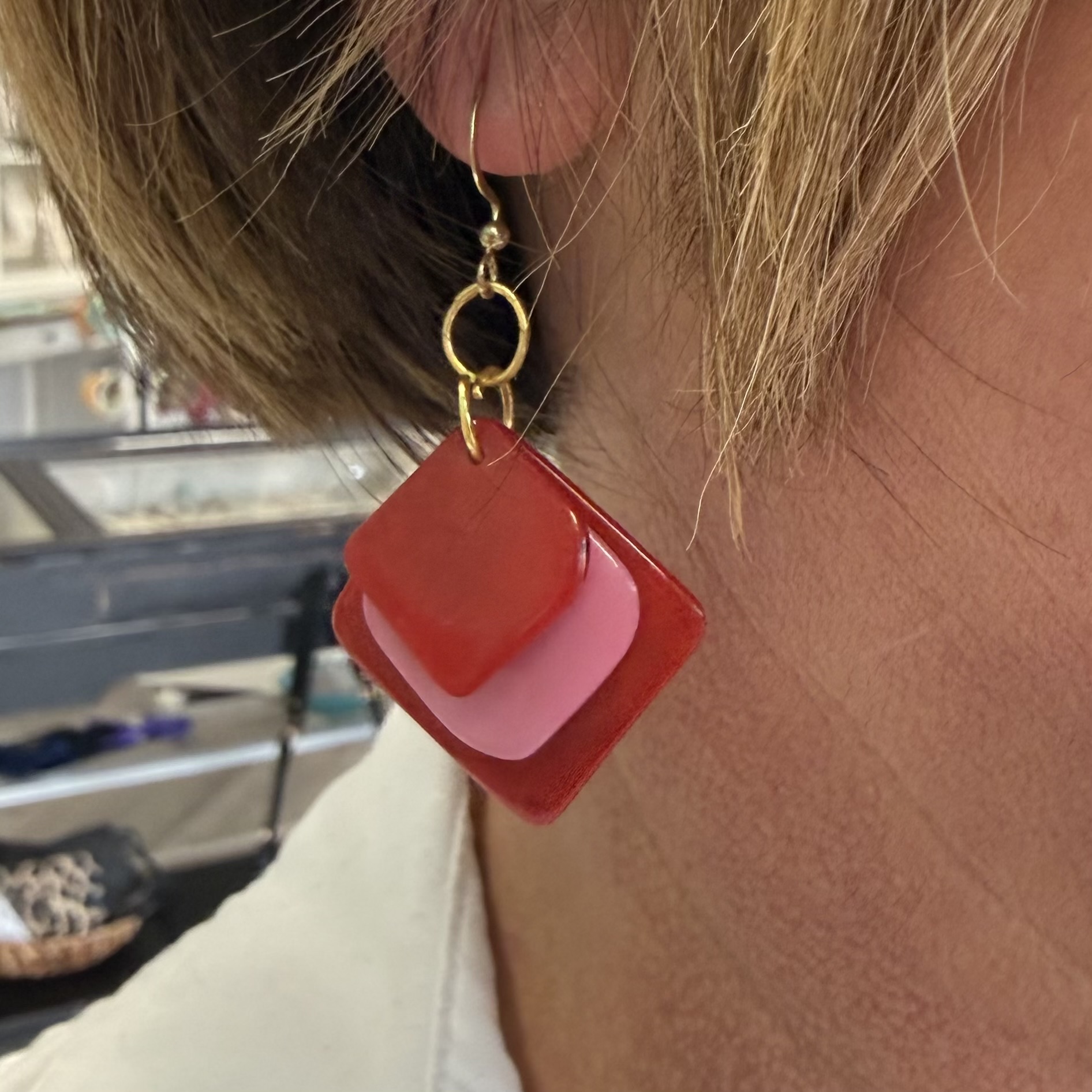 Add a pop of color and artisan charm to your look with the Minerva Dangle Earrings in Red Pink Combo, exclusively crafted by Tagua. Each pair features layered graduated diamond shapes for dimension and they are designed to brighten any outfit with vibrant, eye-catching style.