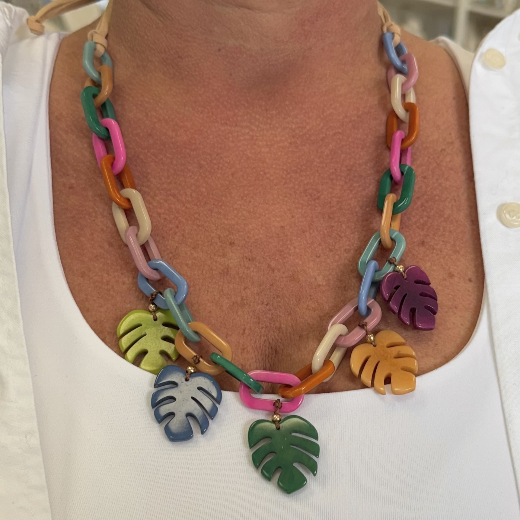 Experience the beauty of divine interconnectedness with the Tagua Palm Nut Handcrafted Pastel Multi Necklace, available at HandPicked. This long, adjustable statement necklace features dozens of softly colored, interconnected tagua rings—symbolizing angels, circles, and the infinite flow of love and spiritual energy.