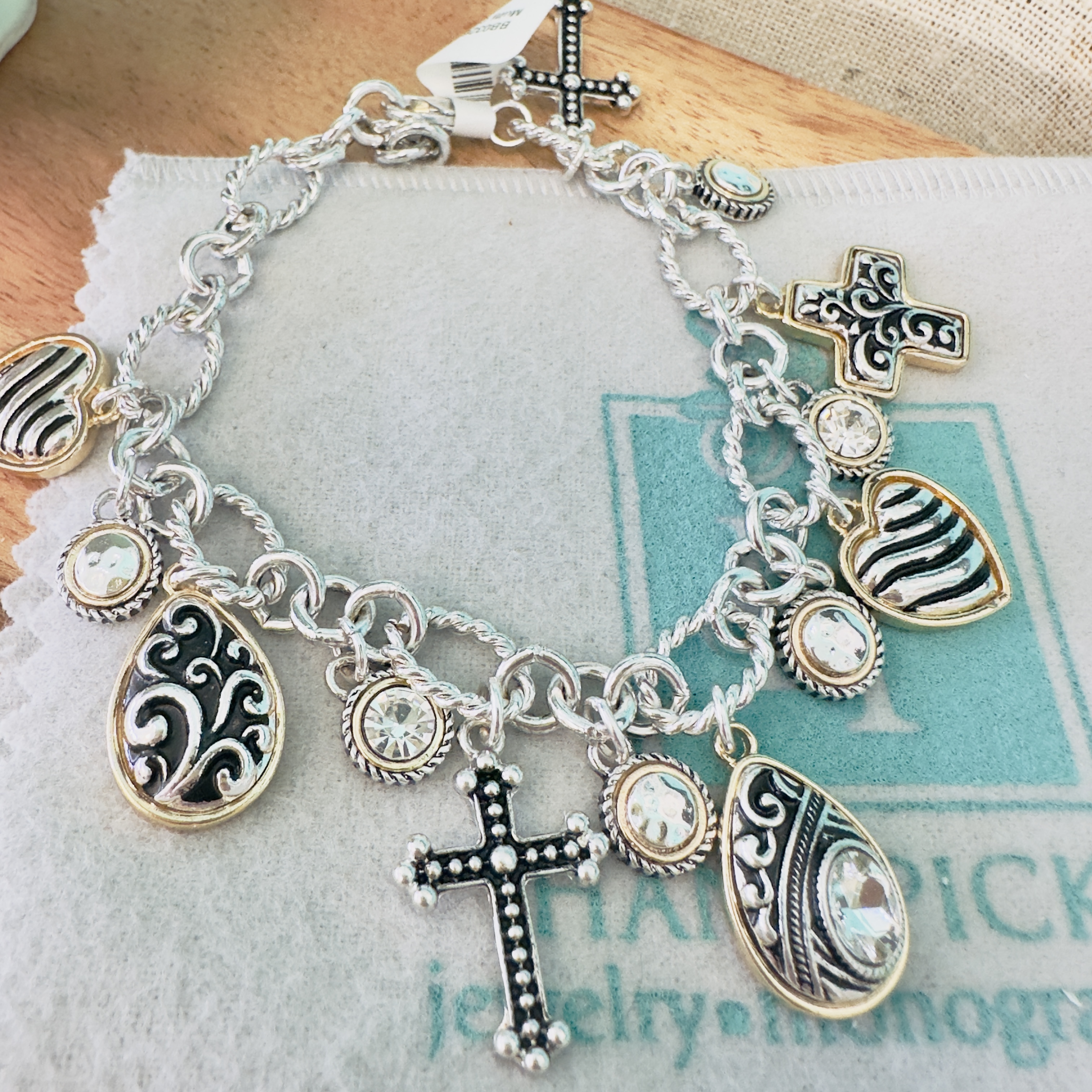 The trendy charm bracelet from HandPicked is a fashion style with dangling hearts and crosses to show off your latest jewelry fashion style this season!